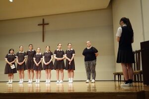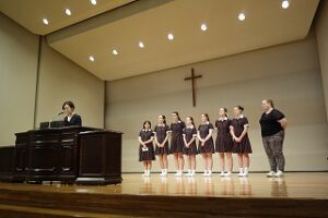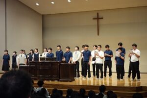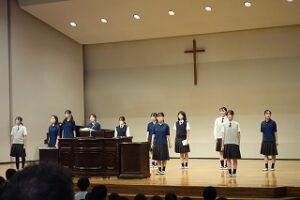 礼拝後の歓迎会では、ファーンスクールの生徒たちが流暢な日本語で挨拶をし、本校の生徒会会長も歓迎の言葉を述べました。また、コーラス部による“It’s a small world”、男子生徒の有志を交えて「レ・ミゼラブル」の劇中歌“民衆の歌”では、未来への希望や仲間と力を合わせる思いを込めました。元気に歌声を披露し、会場は温かい雰囲気に包まれました。