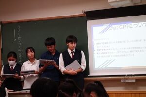生徒たちは、「話題のキャラクター」「人気の遊び」「SNS」「MBTI診断」「生成AI」等、最近の流行がなぜ人を惹きつけるのかを掘り下げ、スライドを効果的に用いて発表しました。スライドのデザインや話し方等、各班が工夫を凝らし、聞き手側も評価シートで採点しながら、興味深く学びました。