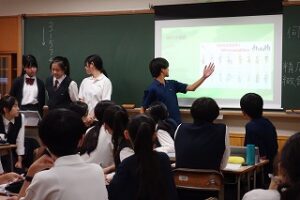 中学2年生の国語の授業で、「今、流行っていることをそれを知らない世代に分かりやすく伝える」をテーマに、班ごとのプレゼンテーションが行われました。