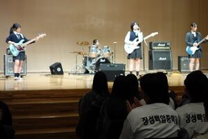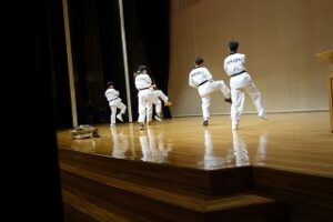 本校の生徒たちがフォークソング部による演奏とダンス部によるパフォーマンスを、韓国長城白岩中学校の生徒の皆さんは、韓国の文化を伝えるテコンドーや歌を披露してくださいました。言葉の壁を越え、会場は拍手であふれていました。