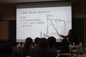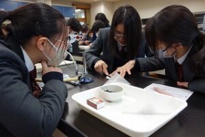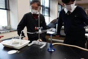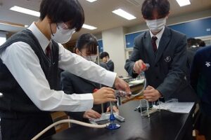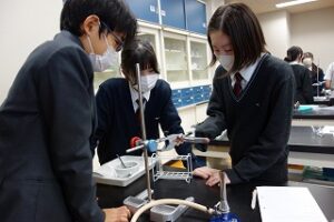 中学2年生が理科1の授業で「酸化物から酸素をとり除く科学変化」の実験を行いました。今回は、黒色の酸化銅という物質から、純粋な金属である銅を取り出すことに挑戦!