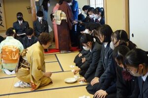 体験は茶道室での基本的な礼儀作法から始まりました。卒業生の皆様による丁寧なご指導のもと、お辞儀や感謝の伝え方など、相手を思いやる「茶の心」を学びました。そして、目の前でお点前を披露していただきました。 お菓子は作りたての薯蕷(じょうよ)饅頭、お抹茶が振る舞われ、日本の伝統的なおもてなしを五感で味わう貴重な時間となりました。