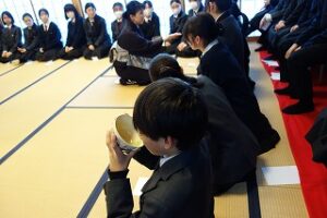 本日、本校の卒業生で成り立つ「丘光会」の中から茶道経験者19名の皆様を講師とし、中学1年生を対象とした茶道体験が行われました。