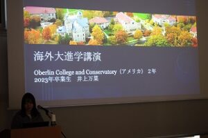 1月22日オリーブホールにて、海外大学進学を希望する在校生および保護者を対象とした講演会を開催いたしました。今回は、2023年度に本校を卒業し、現在はアメリカの Oberlin College and Conservatory 2年生として学ぶ井上万菜さんよりお話を聞きました。