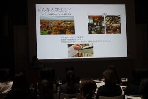講演では、自身の経験に基づき、アメリカの入試システムや奨学金の話、日本とは一味違う現地での学びの深さや多様な価値観に触れる大学生活の様子が紹介されました。