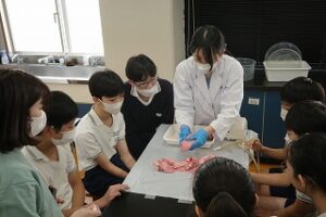 「内臓チーム」は食道や胃、小腸、大腸の消化器官について実物を観察し、時には触りながら、そのはたらきやしくみを学びました。長い小腸や太い大腸、内臓周りについている脂が網目状に広がる様子など興味津々。電動ふいごで肺に空気を入れて膨らますと大きくなり、自分たちの肺もこのように空気を取り入れていることを実感しました。