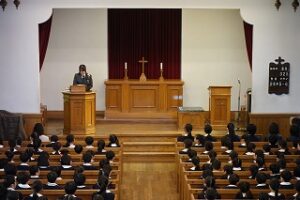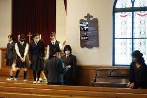 礼拝には小学生、中高生、そして教職員が集まり、共に讃美歌を歌い、静かに祈りを捧げました。