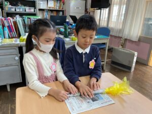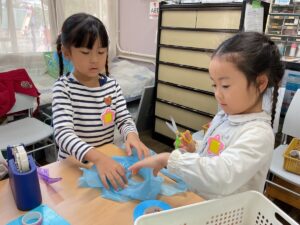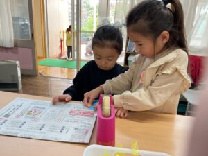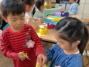 この活動の一環として、年長組がシオン祭にむけて、在園児向けのゲームコーナーの「ダーツ」づくりをしています。