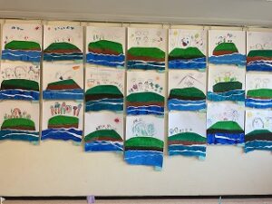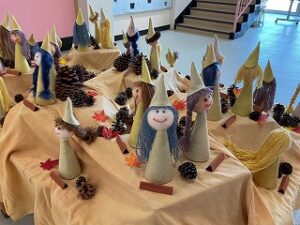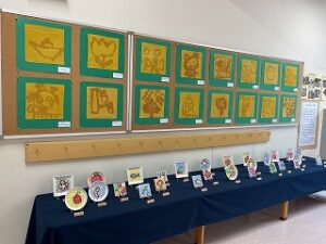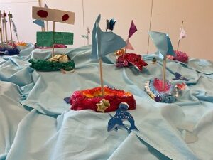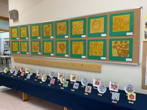 園舎1階には、年少組のかわいいお人形が、2階には年中組の個性いっぱいの船と、年長組の卵の殻でつくった繊細なモザイクアートを展示。ご家族の方々に、じっくりご覧いただきました。