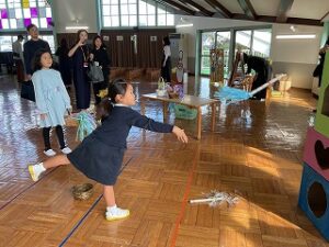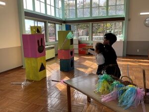 ホールには、ボーリングや新聞紙ダーツなどのゲームコーナーがつくられ、園児の歓声が響いた、楽しいいちにちとなりました。