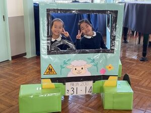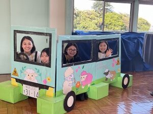 ボーリングコーナー終了後の保護者の方々をパチリ。バスのパネルは、なんと!保護者の方々の手づくりです!!