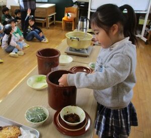 1年がたち子どもたちも、1つ大きくなった年中長児の秋。熟成した味噌でとうとう味噌汁を作ることが出来ました。