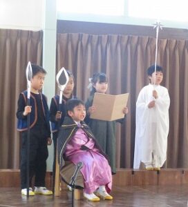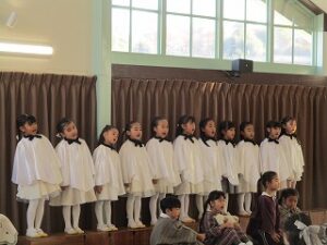 12月18日、幼稚園ではクリスマス礼拝をまもりました。アドベントの期間中、それぞれの学年でイエスさまがお生まれになったときの話を聞き、クリスマスへの思いを深めて過ごし、年長児は、イエスさまがお生まれになったときの劇、ページェントを礼拝の中で捧げました。
