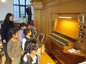 また、会堂内を見学させていただき、大きなパイプオルガンを間近で見、その迫力に感動する姿も見られました。