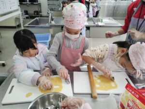 1・2年生はその生地を使って型抜きを行い、サンタさんやトナカイなどのクリスマスらしい形のクッキーが並びました。