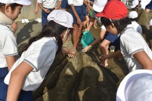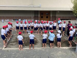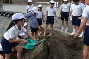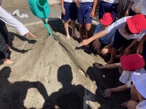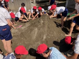 砂場に大きな山を作り、そこに川をつくり、水を流す実験を行いました。カーブの外側ではけずられていく様子が、上流では激しい水の流れで、川が決壊してしまう様子が見られ、百聞は一見に如かず!机上の学習が現実のものとなりました。